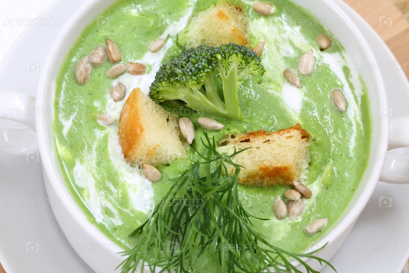 Суп-пюре с брокколи в бульоне из белого супа на деревянном фоне