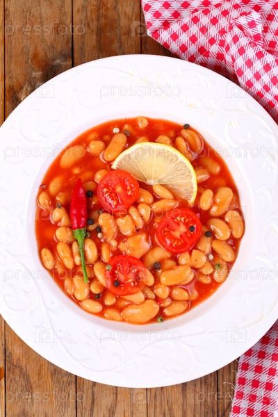 Суп с белой фасолью, томатом в белой тарелке на деревянном фоне