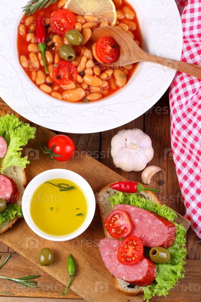 Суп с белой фасолью, томатом в белой тарелке на деревянном фоне