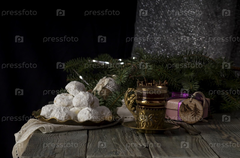 Национальное, рождественское греческое печенье "кураби" и чашка кофе