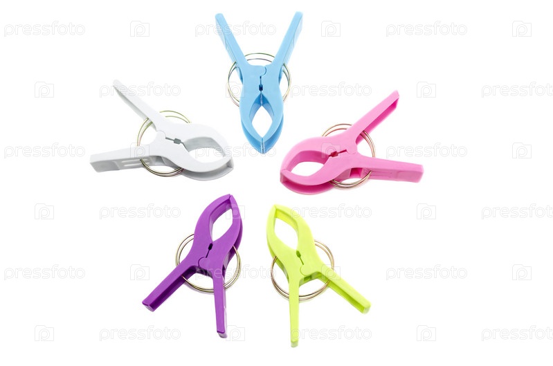 Набор из пяти цветных больших прищепок крупным планом