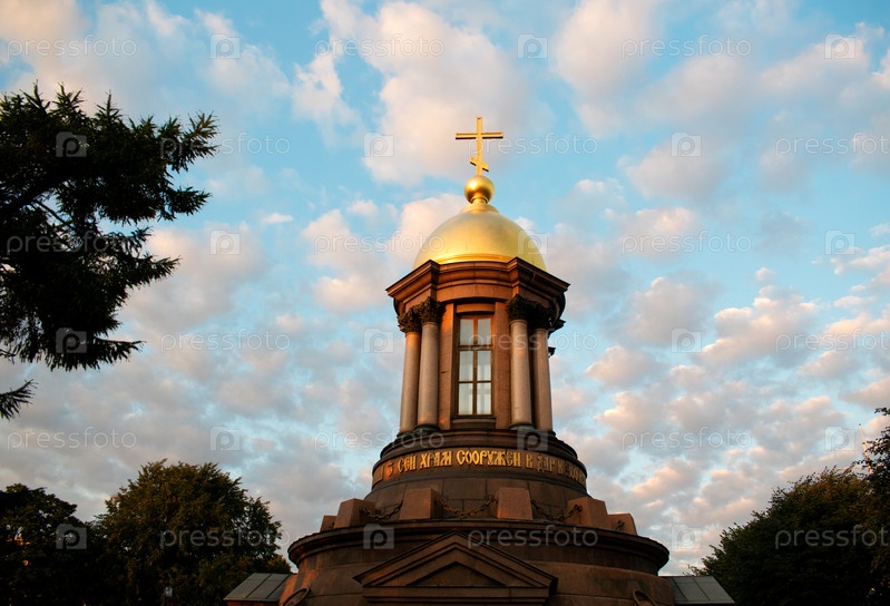 Санкт-Петербург, Россия - 28 августа 2021 года: Троицкая часовня Петра на закате на фоне красивого неба. Православная Церковь. Религиозная архитектура