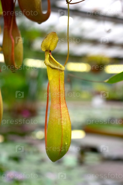 Непентес или кувшинное растение. Тропическое плотоядное растение в ботаническом саду