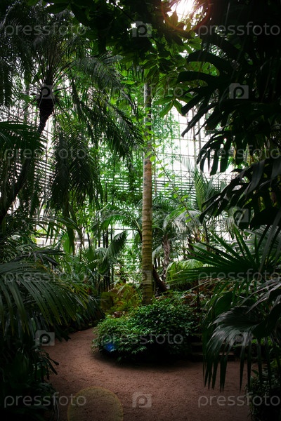 Ботанический сад с пальмой посередине и тропинкой. Тепличные джунгли. Коллекция различных растений