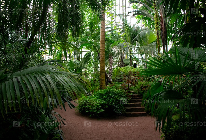 Ботанический сад с пальмой посередине и тропинкой. Тепличные джунгли. Коллекция различных растений