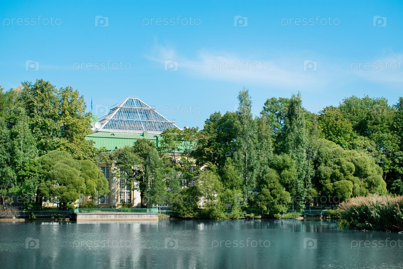 Пейзаж Таврического сада с прудом и голубым небом в Санкт-Петербурге, Россия. Городской парк