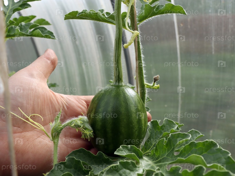 Растущий в теплице арбуз лежит на ладони. выращивание бахчевых в закрытом грунте