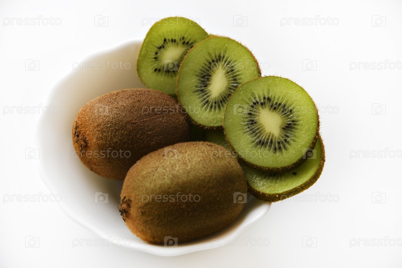 Свежие и сочные киви, нарезанные и целые на белой тарелке. Вкусные фрукты и кусочки зеленого киви