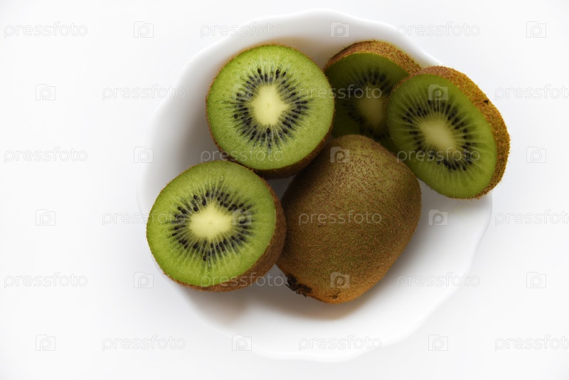Свежие и сочные киви, нарезанные и целые на белой тарелке. Вкусные фрукты и кусочки зеленого киви
