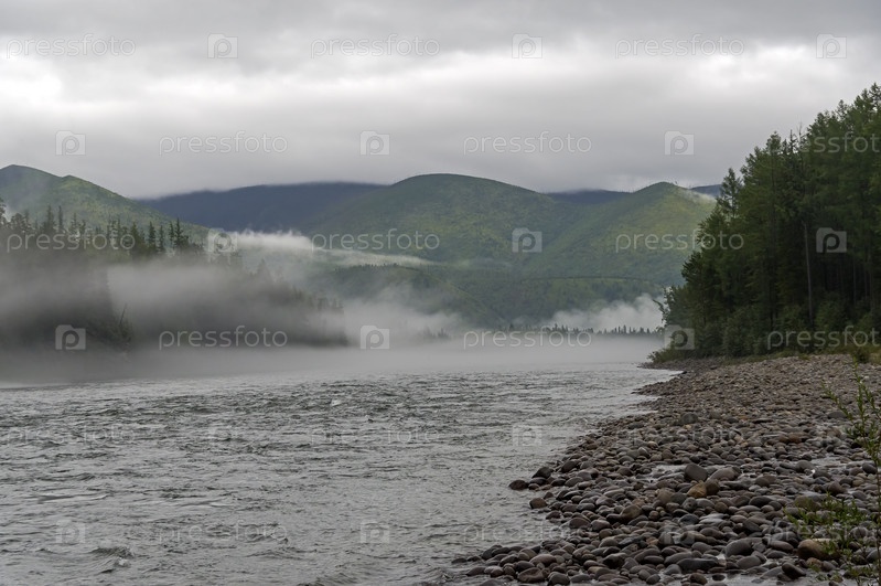 Низкая облачность над рекой Ока Саянская, Иркутская область, Сибирь, Россия. Август