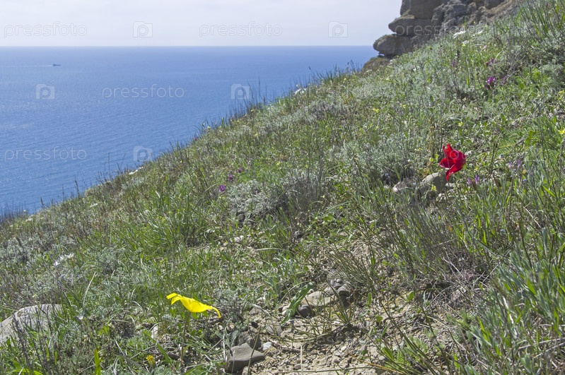 Тюльпан Шренка (лат. Tulipa suaveolens) на каменисто-глинистом склоне горы В России этот вид тюльпанов занесен в Красную книгу Мыс Меган, Крым, конец апреля