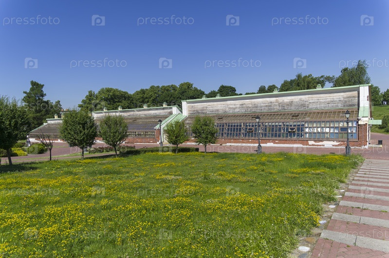 Виноградная оранжерея в Царицынском парке, Москва. Солнечный день в июне