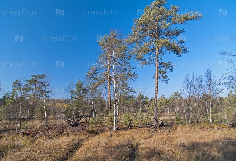 Сосны на торфяном болоте. Солнечный день в конце октября. Ближнее подмосковье