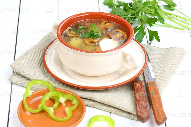 Грибной суп на белом деревянном фоне
