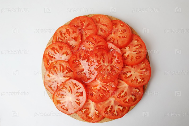 Ломтики свежих помидоров выкладываются на круглую доску. Белый фон, вид сверху