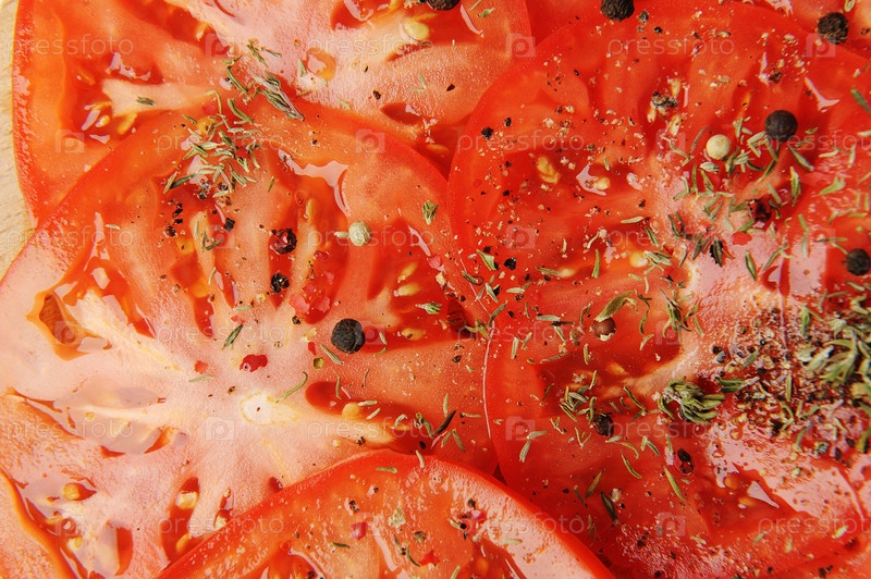 Ломтики помидоров, посыпанные специями и перцем крупным планом. Продовольственный фон