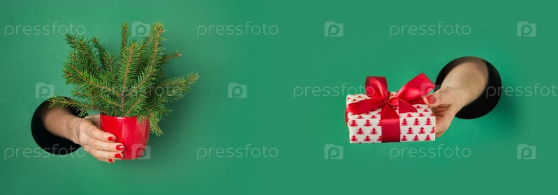 Альтернативная рождественская елка и рождественский подарок в руках женщины из круглого отверстия в зеленой бумаге. Рождественский баннер. Продажа декоративных мячей и игрушек, розыгрыш. Креативная концепция с копировальным пространством