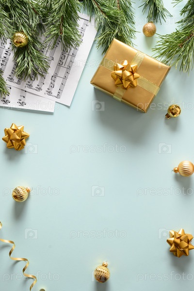 Пустой бланк для рождественских гимнов и поет украшенные золотыми шарами на синем фоне
