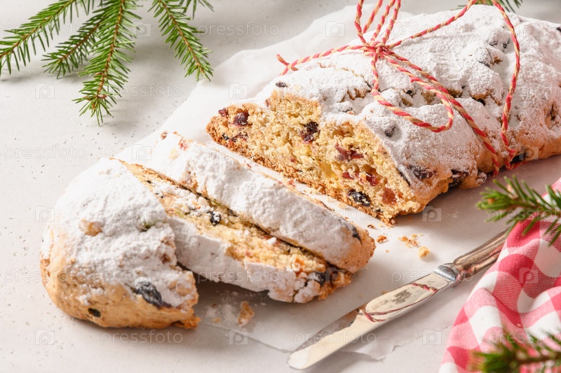 Рождественский столлен с изюмом и цукатами на белом фоне. Закрыть. Вкусный традиционный немецкий хлеб