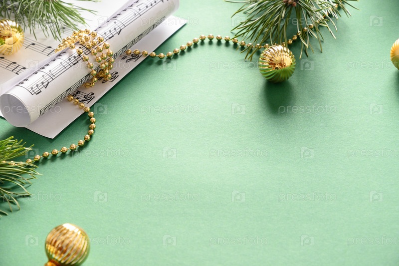 Музыкальная рамка для рождественских гимнов и поет украшенные золотыми шарами на зеленом