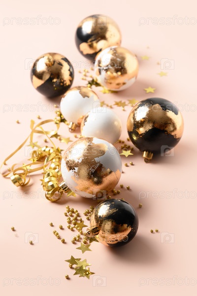Рождественские белые и черные безделушки украшали золотую поталь на розовом. Рождественская вертикальная открытка