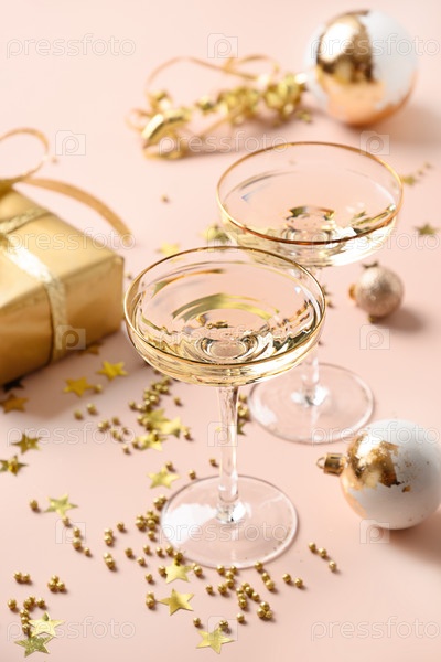 Новогоднее шампанское и рождественские золотые безделушки на белом фоне