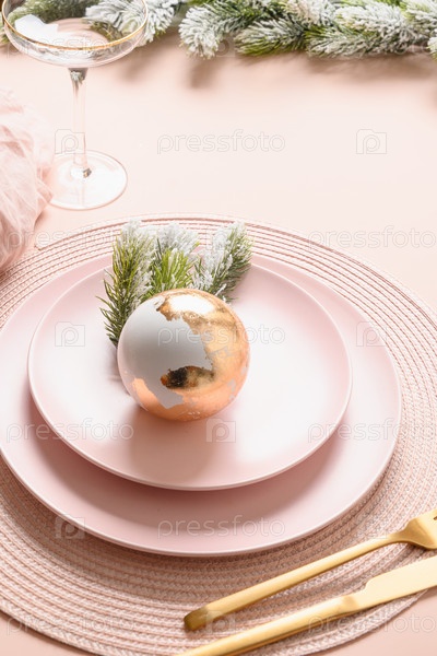 Рождественская монохромная сервировка стола с розовым и золотым современным декором, столовое серебро. Праздничный ужин