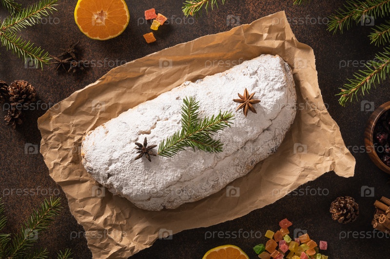 Рождественский штоллен - традиционный немецкий хлеб, украшенный еловыми ветвями и ингредиентами, засахаренными фруктами на коричневом фоне. Вид сверху. Праздничный десерт из теста