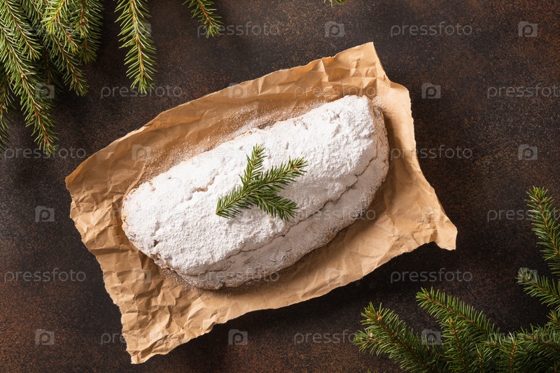 Рождественский столлен - традиционный немецкий хлеб на коричневом фоне. Праздничный десерт из теста. Вид сверху