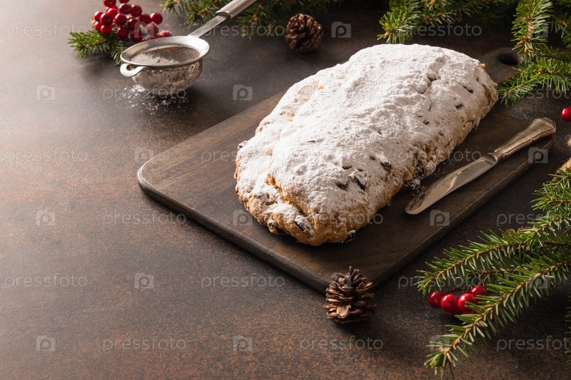 Рождественский столлен - традиционный немецкий хлеб на коричневом фоне. Праздничный десерт из теста. Скопируйте пространство. Закрыть