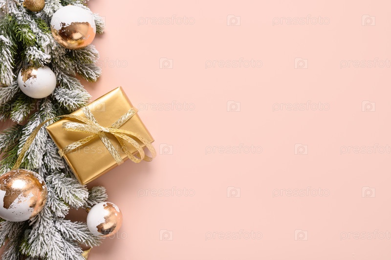 Рождественская рамка с золотым подарком и праздничными роскошными золотыми украшениями со снежными ветвями на пастельно-розовом фоне. Рождественская открытка с копией пространства
