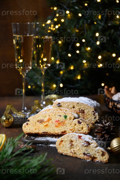 Рождественский штоллен и игристое вино на темном праздничном столе с елкой. Рождественский праздник Немецкий кекс. Закрыть. Вертикальный формат