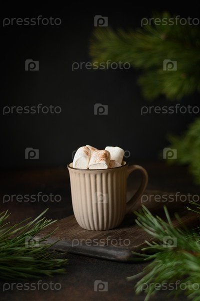 Рождественский кофе или какао с зефиром на темном праздничном столе и вечнозеленых ветвях. Согревающий напиток. Рождество капризное. Закрыть. Вертикальный формат