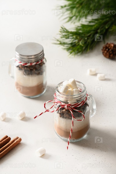 Домашний съедобный рождественский подарок в банке каменщика для шоколадного напитка с зефиром, какао на белом фоне. Закрыть. Рождественские праздничные угощения. Вертикальный формат