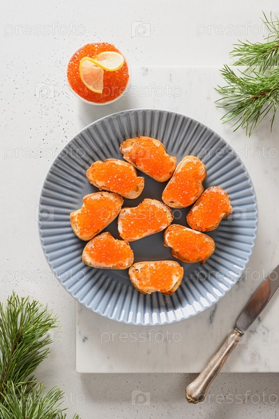 Русская закуска канапе с красной икрой на белом фоне на Рождество