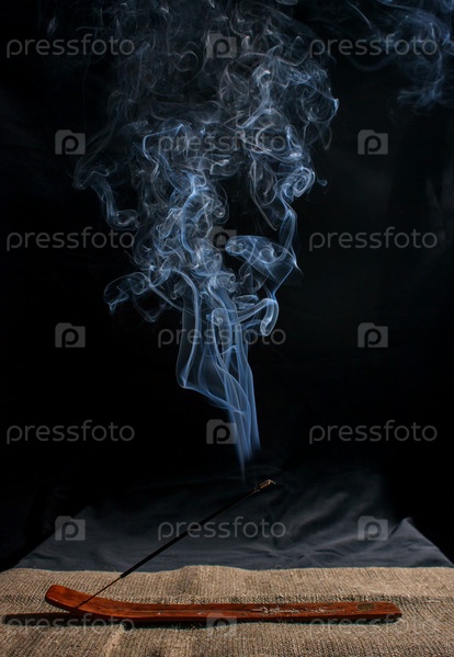 Индийская ароматическая палочка с дымом на черном фоне в помещении крупным планом