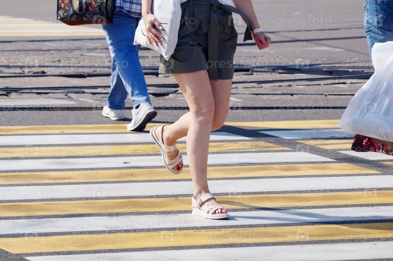 Люди переходят дорогу по пешеходному переходу. ноги крупным планом. на открытом воздухе в солнечный летний день