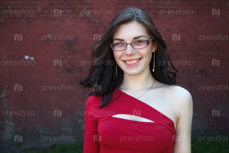 Портрет красивой брюнетки молодой женщины в красном платье и очках в городском парке в летний день