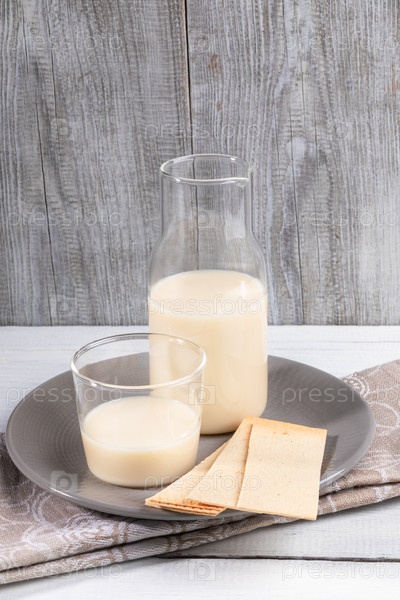 Овсяное молоко в стеклянной бутылке и стакан в серой тарелке на сером деревянном фоне