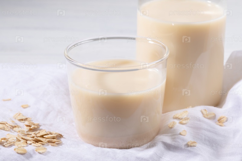 Крупный план овсяного молока и хлопьев на белой льняной салфетке на белом столе