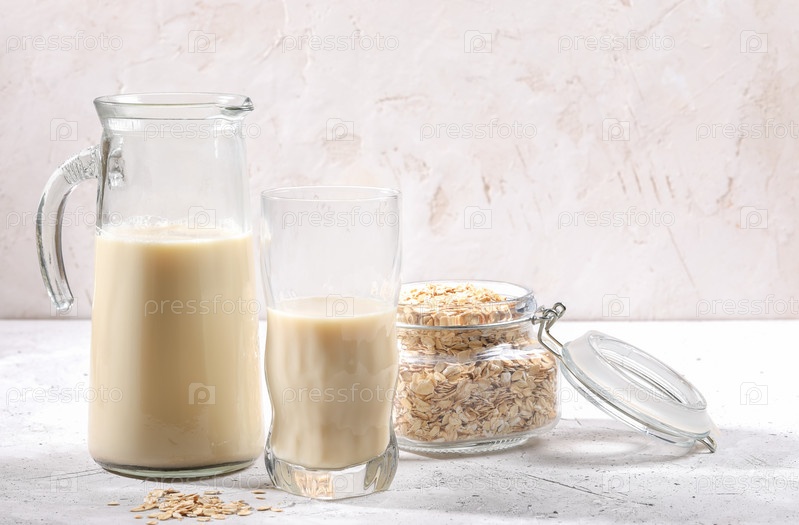 Прозрачный графин и стакан овсяного молока и банка с овсяными хлопьями на белом фоне