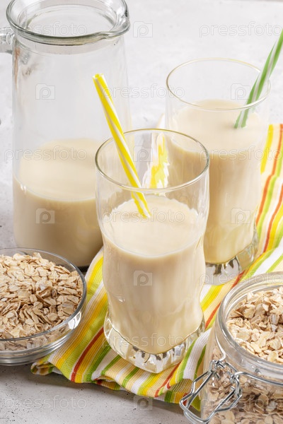 Графин и стаканы с овсяным молоком с соломинкой на желто-зеленом кухонном полотенце