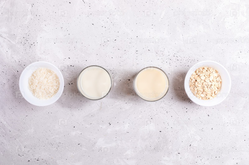 Стаканы с рисом и овсяным молоком, миски с рисовыми семенами и овсяными хлопьями, выложенные в ряд на бетонном фоне