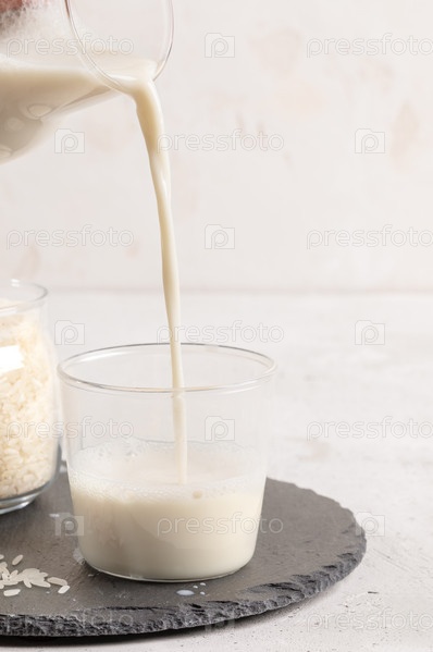 Здоровое рисовое молоко льется из стеклянного графина в стакан на светлом фоне