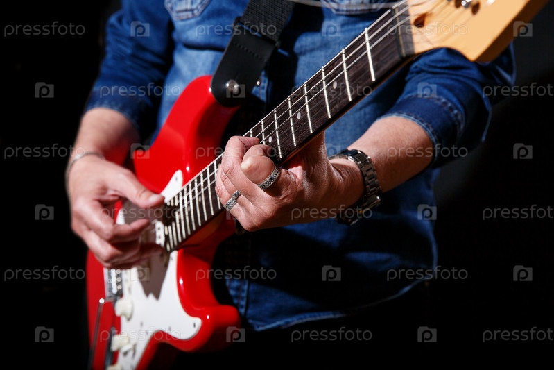 Пожилой мужчина в синей джинсовой рубашке играет на электрогитаре на черном фоне. руки крупным планом