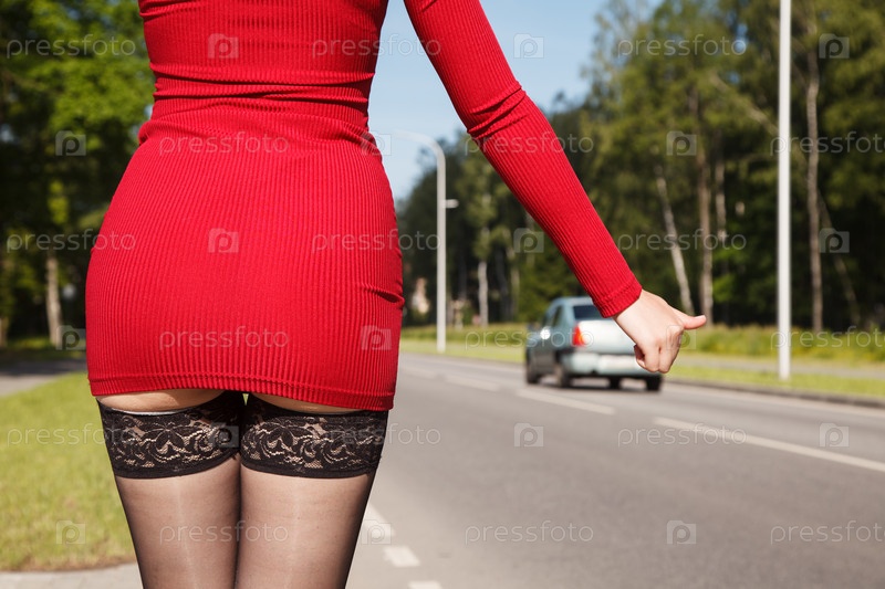Молодая женщина в красном платье и черных нейлоновых чулках останавливает машину в солнечный летний день. ноги крупным планом. вид сзади