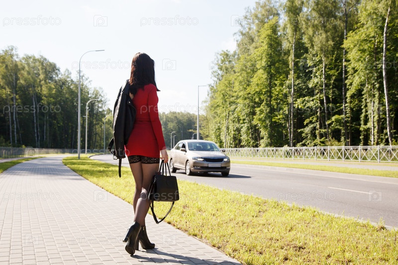 Молодая брюнетка в красном платье гуляет по аллее в парке в солнечный летний день. вид сзади
