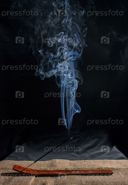 Индийская ароматическая палочка с дымом на черном фоне в помещении крупным планом