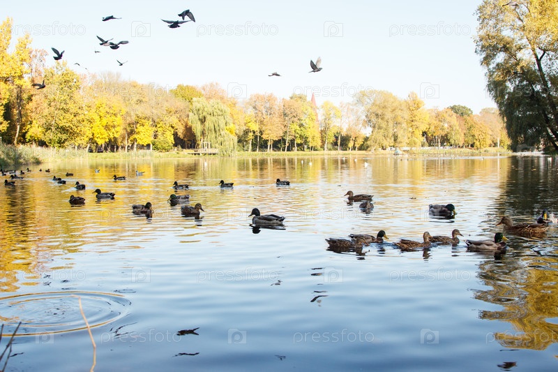 Утки плавают в пруду городского парка в солнечный летний день