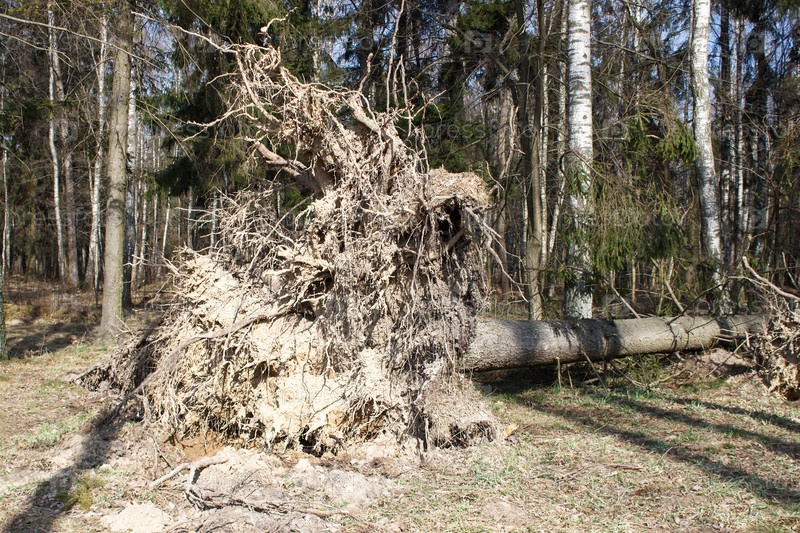 Дерево в лесу, поваленное ураганом в солнечный весенний день